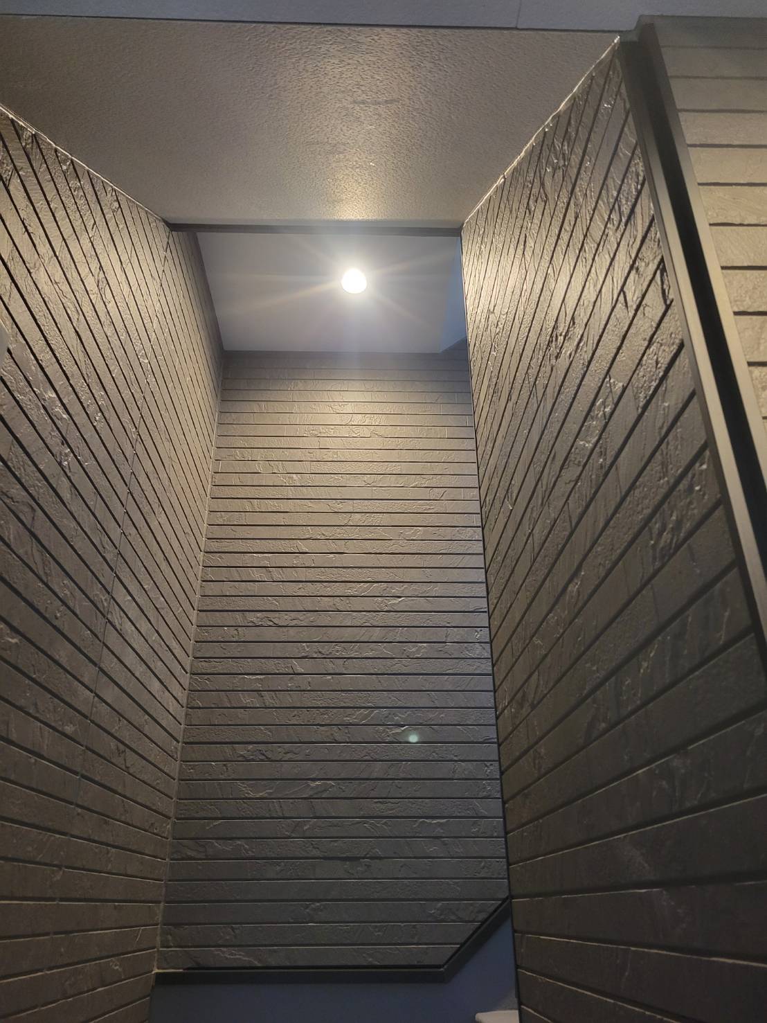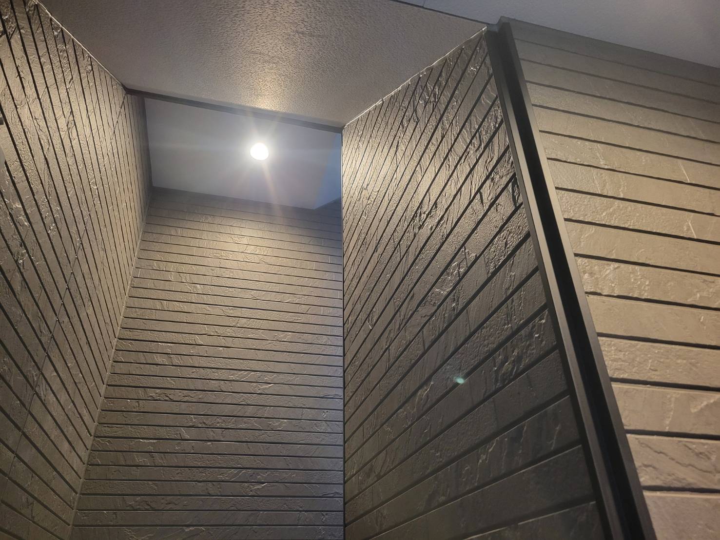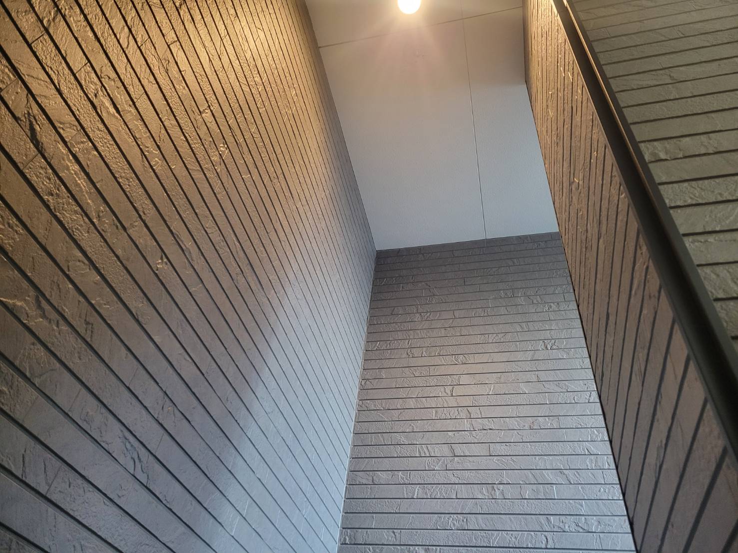 エントランスや階段室の内壁にも同系色のサイディング材を使用することで、内外の統一感を演出しました。